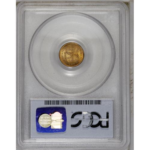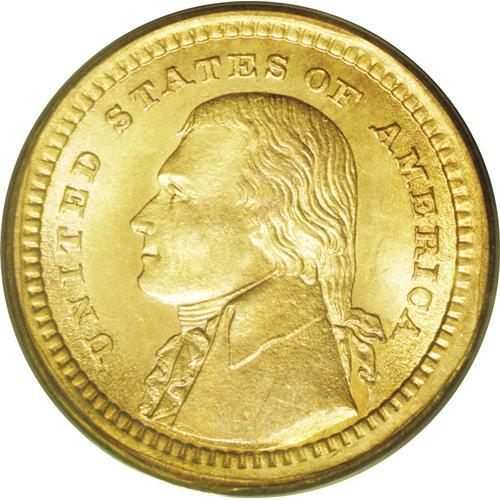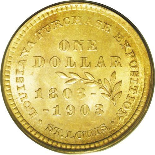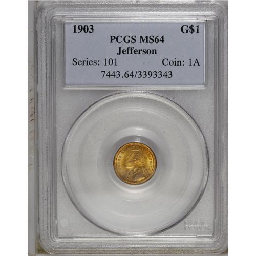 <B>1903<G$1> Louisiana Purchase/Jefferson MS64 PCGS.</B></I> Only 17,500 pieces of this design were minted, with a sizable number of those melted at the Mint. The lavender-accented peach-gold surfaces have pleasing luster, and the devices are almost universally well-defined. Only a few small marks are visible on the surfaces, though these are enough to preclude Gem status.