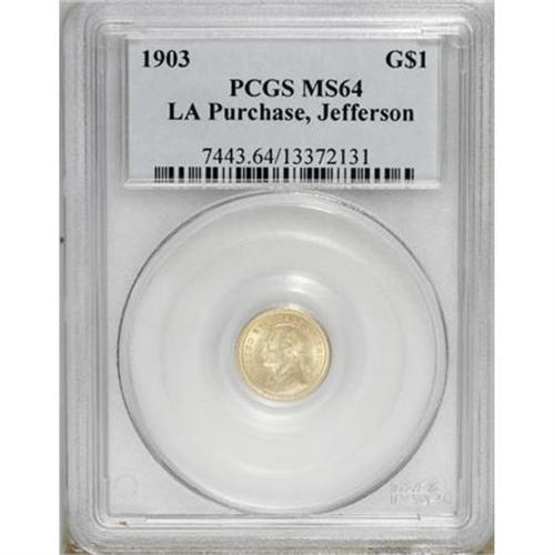 <B>1903 G$1 Louisiana Purchase/Jefferson MS64 PCGS. CAC.</B></I> Lustrous surfaces display yellow-gold color and well struck design elements. A few minor marks do not disturb.<BR><BR><b>Shipping:</b> Coins & Currency (<a target="_blank" href="http://www.heritageauctions.com/common/shipping.php">view shipping information</a>)