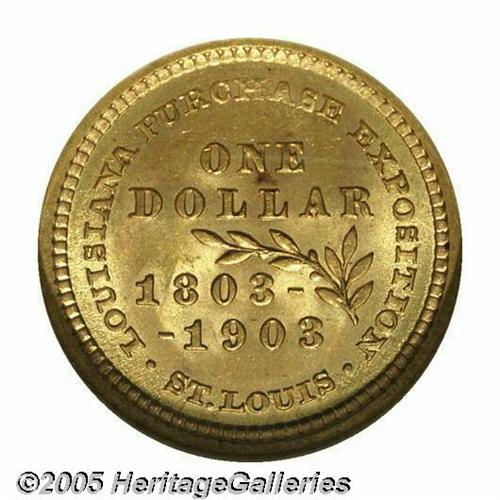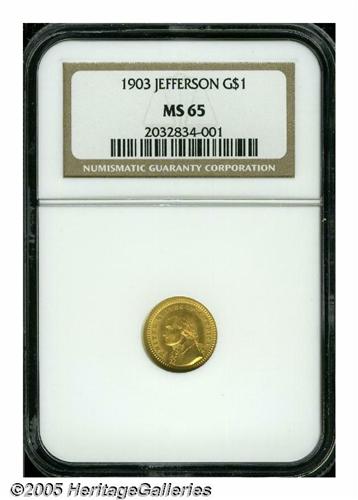 <B>1903<G$1> Louisiana Purchase/Jefferson MS65 NGC.</B></I> Lustrous and pleasing for the grade, with clean surfaces and smooth fields. Well struck by the dies on the obverse, but there is minor weakness on CHASE on the reverse, the area opposite Jefferson's bust. Always in demand in Gem grades.<BR><I>From the Dr. Kurt Peters Collection.</B></I> From the Dr. Kurt Peters Collection.