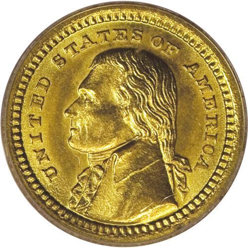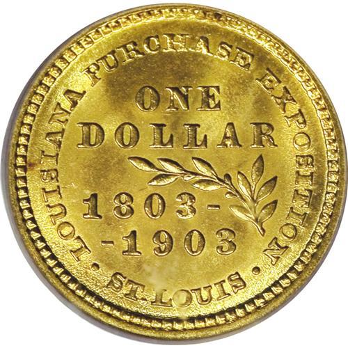 <B>1903 G$1 Louisiana Purchase/Jefferson MS65 PCGS.</B></I> One of two 1903 Louisiana Purchase Exposition gold dollars, this Gem depicts President Thomas Jefferson, who presided over the $15 million Louisiana Purchase. Wonderful luster radiates from golden-green surfaces, and a solid strike brings out excellent detail on the design features. Impeccable preservation shows on both sides. A small alloy spot shows at 9 o'clock on the reverse.<BR><BR><b>Shipping:</b> Coins & Currency (<a target="_blank" href="http://www.heritageauctions.com/common/shipping.php">view shipping information</a>)