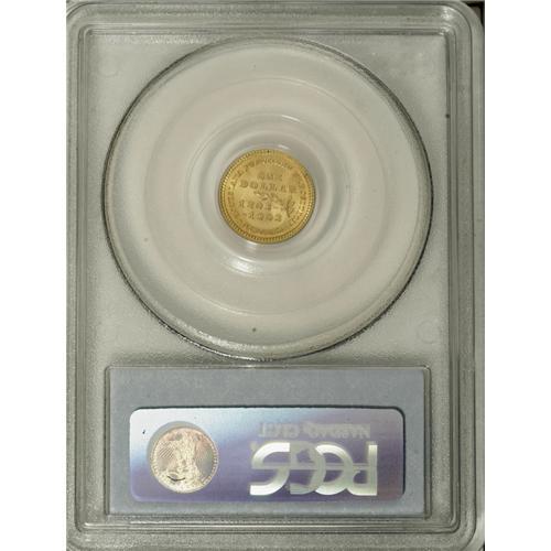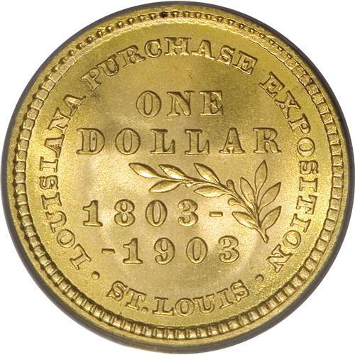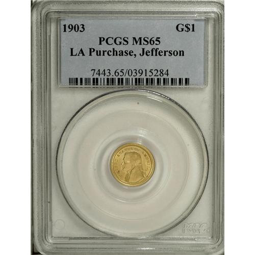 <B>1903 G$1 Louisiana Purchase/Jefferson MS65 PCGS.</B></I> While the original promotion for the Louisiana Purchase pieces included such potentially disastrous offerings as brooches and stickpins, certain purchasers took better care of their examples. The shining butter-yellow surfaces of this Gem reflect decades of conscientious preservation. Well-defined with a single minute copper spot near 12 o'clock on the reverse rim.<BR><BR><b>Shipping:</b> Coins & Currency (<a target="_blank" href="http://www.heritageauctions.com/common/shipping.php">view shipping information</a>)