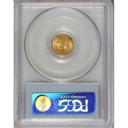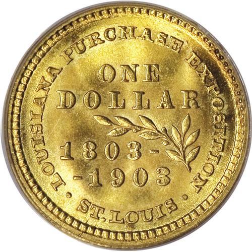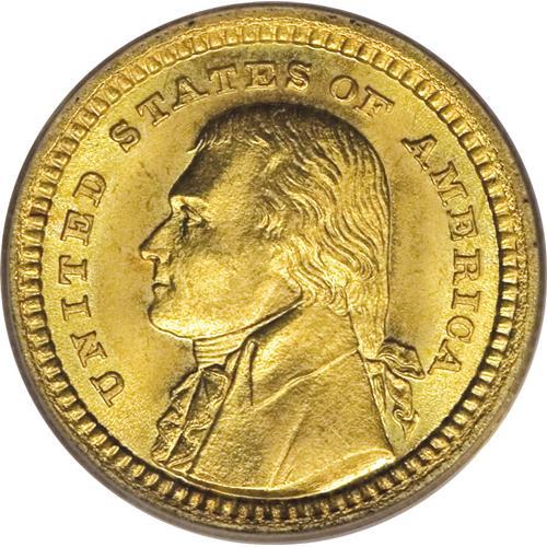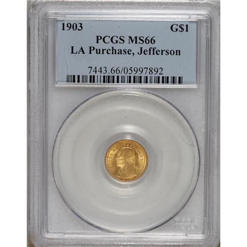 <B>1903 G$1 Louisiana Purchase/Jefferson MS66 PCGS.</B></I> The first commemorative gold dollars, portraying either Jefferson or McKinley, observe the 100th anniversary of the agreement between France and the United State for the Louisiana Purchase presided over by President Thomas Jefferson, which basically doubled the land mass of the continental United States by adding all of the territory west of the Mississippi River and east of the Rocky Mountains. This Jefferson piece offers distraction-free, lustrous, deep orange-gold surfaces.<BR><BR><b>Shipping:</b> Coins & Currency (<a target="_blank" href="http://www.heritageauctions.com/common/shipping.php">view shipping information</a>)