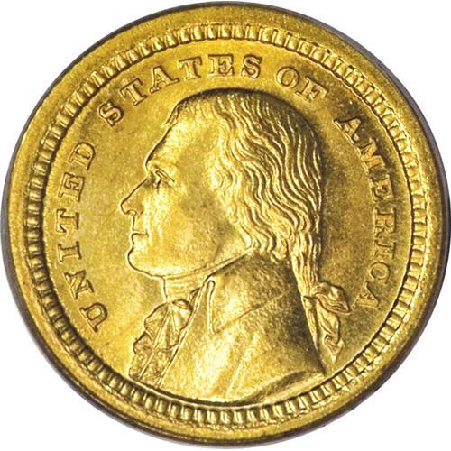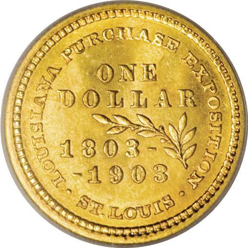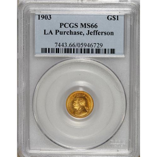 <B>1903 G$1 Louisiana Purchase/Jefferson MS66 PCGS.</B></I> Two varieties of the Louisiana Purchase Exposition gold dollars were created, one featuring a portrait of Thomas Jefferson who spear headed the Louisiana Purchase, and the other depicting William McKinley who was President at the time that the convention was first planned. A sharp strike and deep honey-gold color are the hallmarks of this reflective, nearly prooflike Premium Gem. Both sides have nearly perfect surfaces with radiant luster and exceptional aesthetic appeal. Only 67 finer examples of this commemorative gold dollar have been certified by PCGS.<BR><BR><b>Shipping:</b> Coins & Currency (<a target="_blank" href="http://www.heritageauctions.com/common/shipping.php">view shipping information</a>)