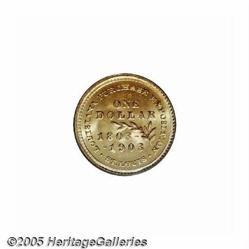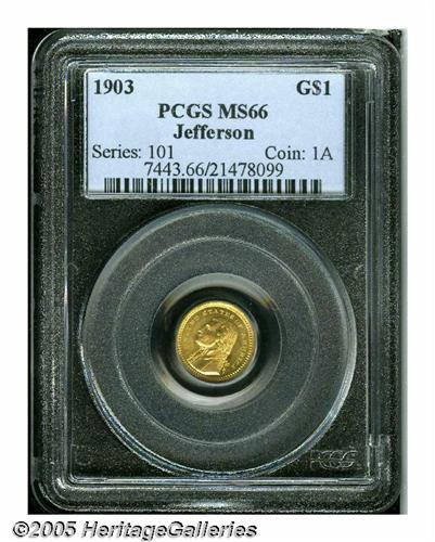 <B>1903<G$1> Louisiana Purchase/Jefferson MS66 PCGS.</B></I> Intricately detailed with a clean, satiny finish and a subtle green-golden appearance. A tiny copper alloy spot is noted behind Jefferson's head on the obverse.