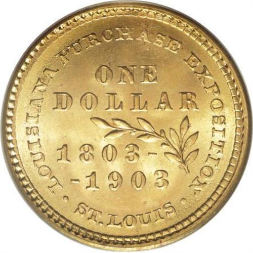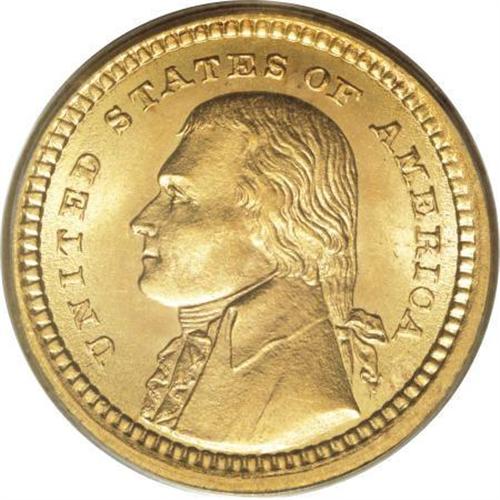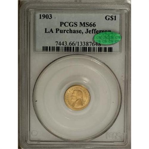 <B>1903 G$1 Louisiana Purchase/Jefferson MS66 PCGS. CAC.</B></I> Light peach centers are framed by lighter green-gold margins. Well struck save for the A in PURCHASE, opposite Jefferson's high relief shoulder. By 1903, Thomas Jefferson had already appeared on stamps and paper money, but the Louisiana Purchase gold dollar was his debut on American coinage, more than a third of a century prior to the advent of his namesake nickel.<BR><BR><b>Shipping:</b> Coins & Currency (<a target="_blank" href="http://www.heritageauctions.com/common/shipping.php">view shipping information</a>)