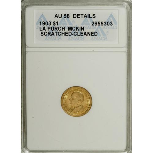 <B>1903 G$1 Louisiana Purchase/McKinley--Cleaned, Scratched--ANACS. AU58 Details.</B></I> NGC Census: (42/1620). PCGS Population (113/2666). Mintage: 17,500. Numismedia Wsl. Price for NGC/PCGS coin in AU58: $565. (#7444)<BR><BR><b>Shipping:</b> Coins & Currency (<a target="_blank" href="http://www.heritageauctions.com/common/shipping.php">view shipping information</a>)