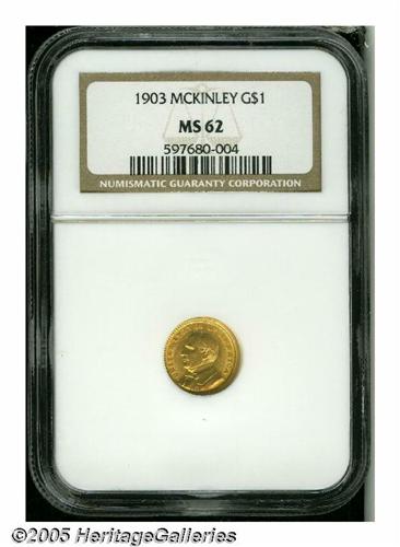 <B>1903<G$1> Louisiana Purchase/McKinley MS62 NGC.</B></I> A well struck representative that has bright honey-gold color and blazing cartwheel luster. A few minor handling marks are noted over each side, but the overall eye appeal is strong for the grade.