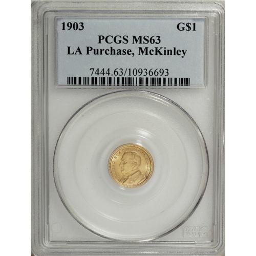 <B>1903 G$1 Louisiana Purchase/McKinley MS63 PCGS.</B></I> The obverse of this essentially yellow-gold commemorative exhibits slight granularity. Lightly marked with typical detail and a small olive spot at the second A of LOUISIANA on the reverse.<BR><BR><b>Shipping:</b> Coins & Currency (<a target="_blank" href="http://www.heritageauctions.com/common/shipping.php">view shipping information</a>)