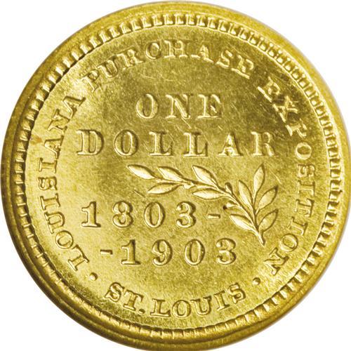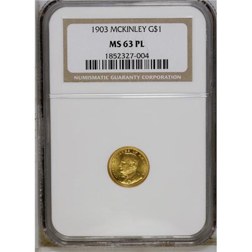 <B>1903 G$1 Louisiana Purchase/McKinley MS63 PL NGC.</B></I> An unusually reflective example with a touch of olive on the reverse of this otherwise yellow-gold piece with crisply defined devices. A set of parallel abrasions behind McKinley's head account for the grade. Prooflike examples are elusive; NGC has granted the Prooflike designation to only six of the Louisiana Purchase/McKinley commemoratives. Census: 3 in 63 Prooflike, 1 finer (10/06).<BR><BR><b>Shipping:</b> Coin/Currency (<a target="_blank" href="http://www.heritageauctions.com/common/shipping.php">view shipping information</a>)