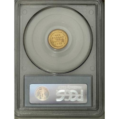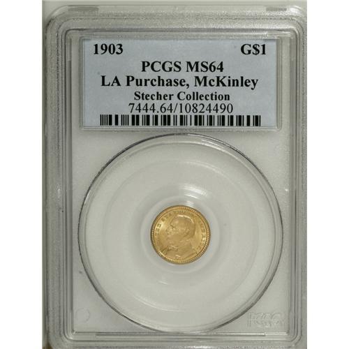 <B>1903 G$1 Louisiana Purchase/McKinley MS64 PCGS.</B></I> Sharply struck with bright lime-gold surfaces that are carefully preserved and show just one tiny luster break, immediately behind McKinley's head. A lustrous and visually alluring near-Gem. A collector's envelope marked "1903 McKinley unc perfect" accompanies the lot.<BR><I>From The Stecher Collection.</B></I><BR><BR><b>Shipping:</b> Coins & Currency (<a target="_blank" href="http://www.heritageauctions.com/common/shipping.php">view shipping information</a>)