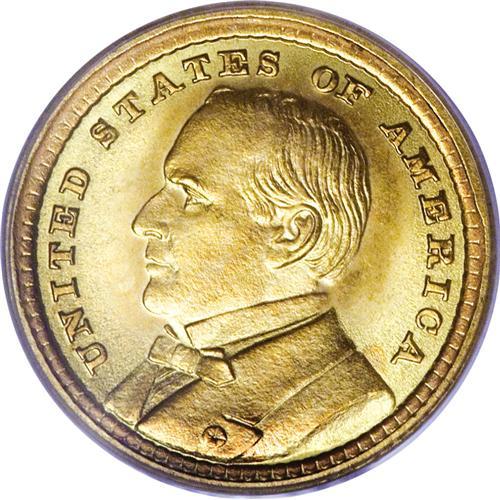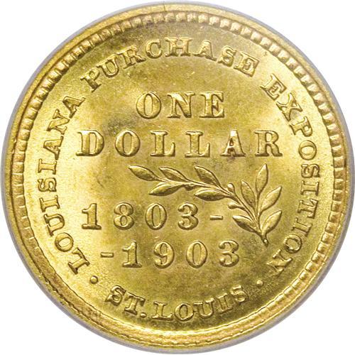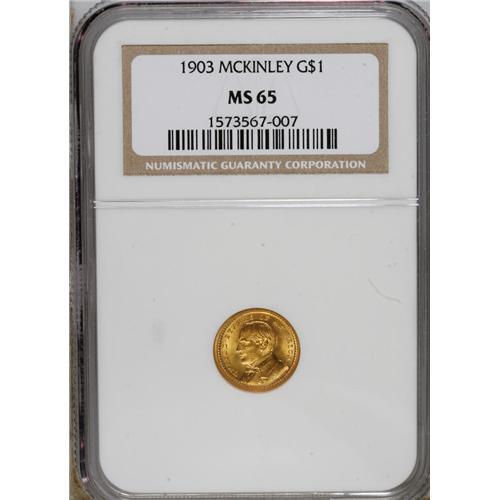 <B>1903 G$1 Louisiana Purchase/McKinley MS65 NGC.</B></I> This Gem McKinley gold dollar commemorative displays a well executed strike, as all of the design elements are sharply delineated, including the strands of hair on McKinley's head. Bright peach-gold surfaces exhibit a touch or two of light green, and both sides emit blazing luster. Fantastic overall eye appeal!<BR><BR><b>Shipping:</b> Coins & Currency (<a target="_blank" href="http://www.heritageauctions.com/common/shipping.php">view shipping information</a>)