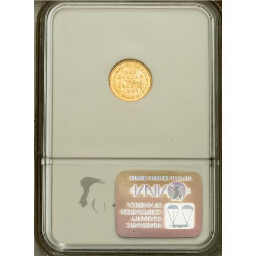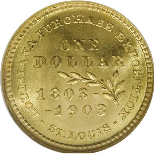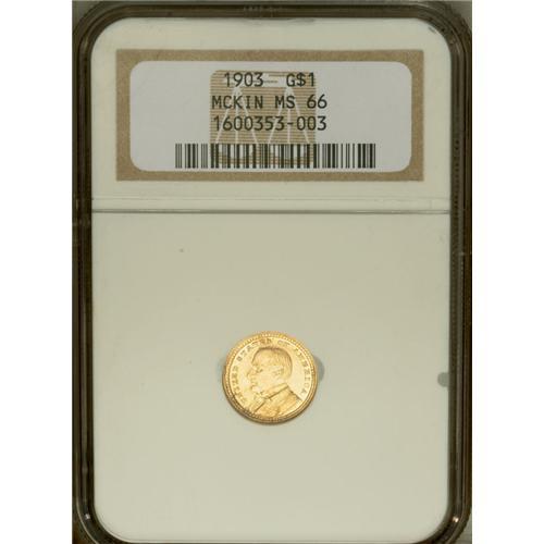 <B>1903 G$1 Louisiana Purchase/McKinley MS66 NGC.</B></I> Bright straw-gold satiny surfaces with pinpoint detailing on the highpoints. A small flyspeck above the eye of this slain President keeps this Premium Gem from an even higher technical grade. NGC has only graded 81 finer (12-06).<BR><BR><b>Shipping:</b> Coin/Currency (<a target="_blank" href="http://www.heritageauctions.com/common/shipping.php">view shipping information</a>)