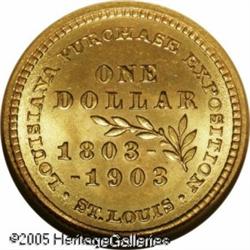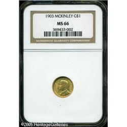 <B>1903 G$1 Louisiana Purchase/McKinley MS66 NGC.</B></I> Warmly colored, yellow-gold surfaces are lustrous with a mostly soft, frosted sheen. We cannot find a single abrasion that would call into question the assigned grade. Lot:8640