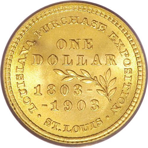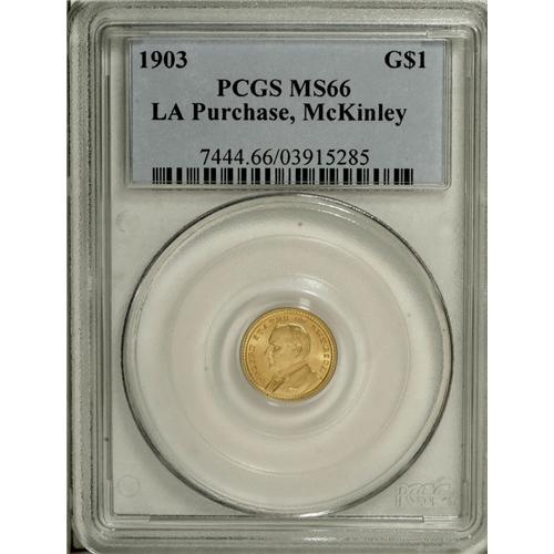 <B>1903 G$1 Louisiana Purchase/McKinley MS66 PCGS.</B></I> Sharply struck with deep shades of yellow that border on mustard-gold. The practically pristine surfaces radiate powerful luster. While few numismatists give the McKinley design any beauty prizes, most scholars acknowledge that the lack of statutory legends makes the diminutive coins appear less crowded.<BR><BR><b>Shipping:</b> Coins & Currency (<a target="_blank" href="http://www.heritageauctions.com/common/shipping.php">view shipping information</a>)