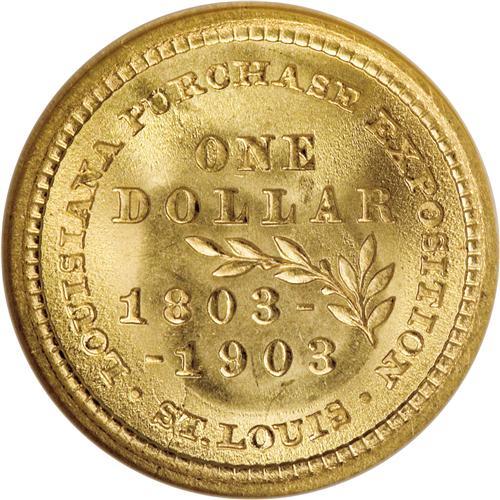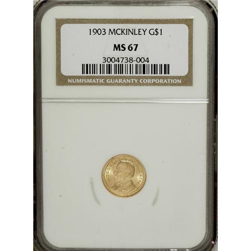 <B>1903 G$1 Louisiana Purchase/McKinley MS67 NGC.</B></I> Numismatic entrepreneur and promoter Farran Zerbe sold thousands of the Louisiana Purchase gold dollars to B. Max Mehl, the legendary Fort Worth, Texas, coin dealer. Today few pieces survive in so fine a grade: PCGS and NGC have each graded only a single piece finer. The surfaces are expectedly pristine and free of distractions, with beautiful green-gold patina. A tiny copper-colored alloy spot tinges the base of the first T in STATES. Census: 83 in 67, 1 finer (4/07).<BR><BR><b>Shipping:</b> Coins & Currency (<a target="_blank" href="http://www.heritageauctions.com/common/shipping.php">view shipping information</a>)