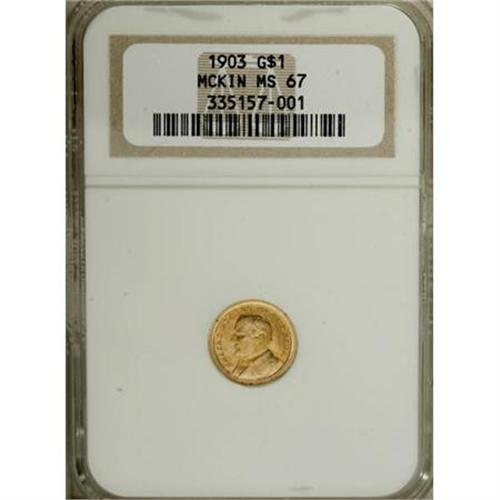 <B>1903 G$1 Louisiana Purchase/McKinley MS67 NGC.</B></I> Originally intended to commemorate the centennial of the Louisiana Purchase, this issue was extended in order to pay homage to the recently assassinated President McKinley. This outstanding example is sharply struck, with faint die striations noted in the obverse fields, and two or three tiny alloy spots that are of little consequence. Census: 85 in 67, 1 finer (11/07). <BR><I>From The Pinetop Collection.</B></I><BR><BR><b>Shipping:</b> Coins & Currency (<a target="_blank" href="http://www.heritageauctions.com/common/shipping.php">view shipping information</a>)