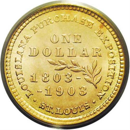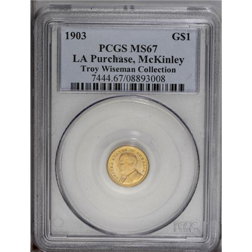 <B>1903<G$1> Louisiana Purchase/McKinley MS67 PCGS.</B></I> This glittering Superb Gem boasts pumpkin-gold surfaces on both sides, accented by glints of hazel. The surfaces on each side are fairly frosty, with extensive die polish lines showing in the obverse field. A tiny planchet flaw is noted between D S in UNITED STATES. Nearly unimprovable quality, as both NGC and PCGS have each graded a single specimen finer (8/06).<BR><I>From The Troy Wiseman Collection.</B></I>
