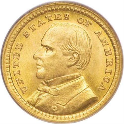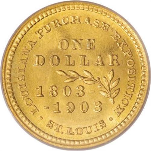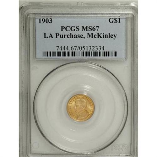 <B>1903 G$1 Louisiana Purchase/McKinley MS67 PCGS.</B></I> Certainly in the upper echelon of Mint State survivors, this Superb example is struck with the exactness of detail that is nearly expected of the issue and boasts satiny surfaces of impeccable quality. Even close inspection fails to provide a mentionable disturbance. Population: 73 in 67, 1 finer (7/07).<BR><BR><b>Shipping:</b> Coins & Currency (<a target="_blank" href="http://www.heritageauctions.com/common/shipping.php">view shipping information</a>)
