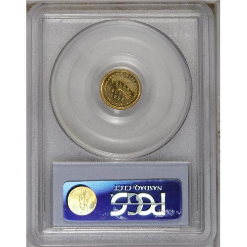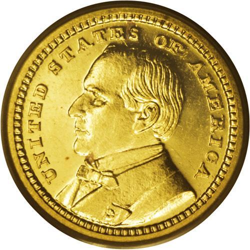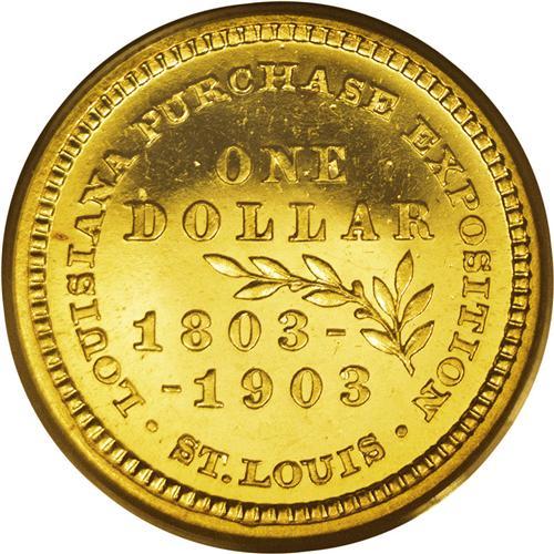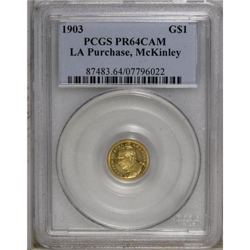 <B>1903<G$1> Louisiana Purchase/McKinley PR64 Cameo PCGS.</B></I> It is reported that 100 proofs of each Louisiana Purchase Exposition gold dollar were coined and sealed with a piece of imprinted cardboard. These proofs are attractive pieces, as illustrated by this example, with bright yellow-gold surfaces and hints of greenish color. A single small copper spot is evident on the reverse. This example has deeply mirrored fields that exhibit faint hairlines, which have prevented a higher grade. The motifs on each side are exceptionally well detailed, much as Charles Barber intended when he prepared the design.