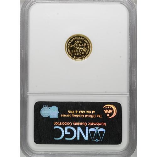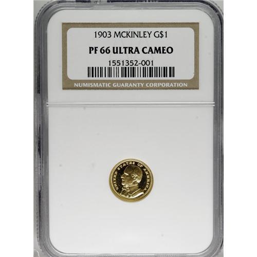<B>1903 G$1 McKinley PR66 Ultra Cameo NGC.</B></I> Breen relates that the first 100 examples of this commemorative gold dollar type were brilliant proofs, including the present offering. About half that number survive today, in all grades, according to NGC and PCGS population data; not counting multiple submissions or coins that remain uncertified. This piece is currently the finest-graded of them all, and is the only specimen to be designated as Ultra Cameo by NGC (4/07). It is easy to see why, with majestically deep mirrors displayed in the fields, and lavish mint frost over the flawlessly struck devices. Tiny marks on the portrait of President McKinley, and wispy die polish lines above ONE on the upper reverse field are only visible with the aid of magnification. A serious bid will undoubtedly be required in order to win this conditionally unsurpassed Premium Gem.<BR><BR><b>Shipping:</b> Coins & Currency (<a target="_blank" href="http://www.heritageauctions.com/common/shipping.php">view shipping information</a>)
