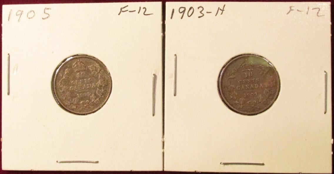 1903 H Fine & 1905 Fine Canada Silver Dimes. Catalog value $60.00.