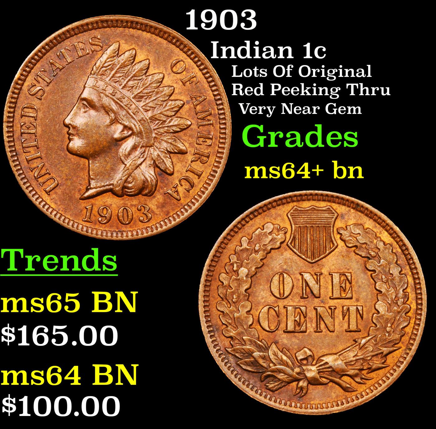 1903 Indian Cent 1c Grades Choice+ Unc BN.