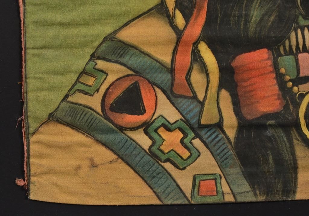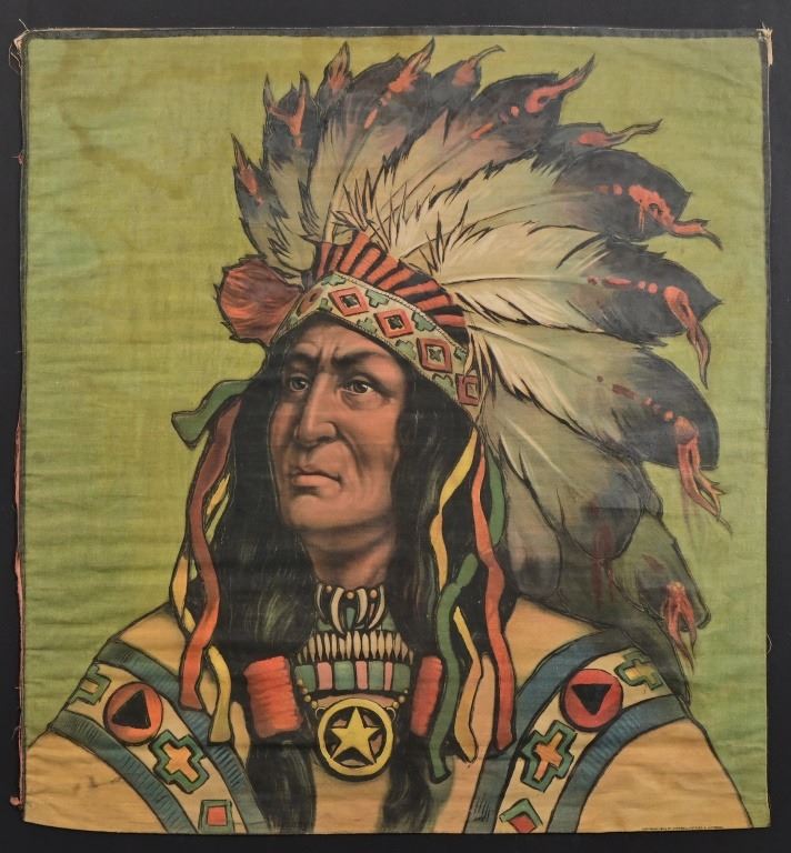 Campbell, Metzger & Jacobsen Chromolithograph on fabric of a Native American Chief, copyright 1903 lower right. Frame measures 29" x 29"