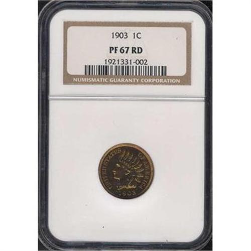 <b>1903 Indian Head Cent. NGC graded PF67 R.</b> NGC Pop: 2/0. A high degree of luster graces the gleaming deep-red surfaces of this dazzling "Red" gem. A dullish impression was left by the recoil of the dies that struck some Proofs, hard as that may be to accept, however, we're pleased to see and report that this superlative 1903 is the exception to that rule. Proof mintage was only 1,790 pieces <b>(PCGS # 2398)</b>