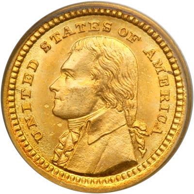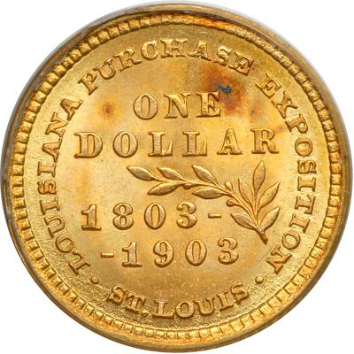 1903 Louisiana Purchase-Jefferson Gold Dollar. PCGS graded MS-65. Lovely rich toning. 17,500 minted. Has a few light flakes or surface voids in the luster left of Jefferson (as made). This exceptionally pleasing MS65 example has lovely pinkish apricot patina over each side with not so subtle full frosty luster from top to bottom. Well struck in all areas with pinpoint detailing on the collar and ruffled front of Jefferson's shirt, as well as other areas of the design. Certain rules have to be followed when bidding on this piece. Rule #1: expect lots of competition (PCGS # 7443).