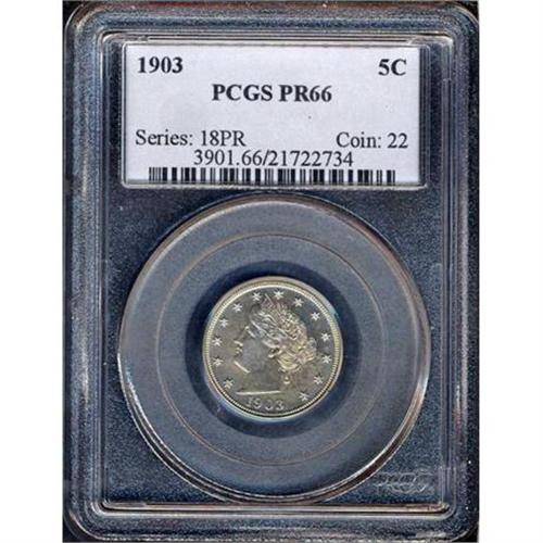 <b>1903 Liberty Nickel. PCGS graded Proof 66.</b> Sparkling nickel blue iridescence imbues this "all brilliant" Liberty nickel beauty with a life of its own. Add a high degree of flash and the appeal is virtually irresistible. The bold relief of the design lifts itself confidently off the smooth fields surrounding <b>(PCGS # 3901)</b>