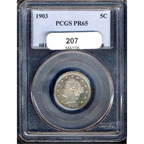 <b>1903 Liberty Nickel. PCGS graded Proof 65.</b> A few sprinkles of flyspecks on the surface. A desirable lustrous gem. The obverse explodes with bright mirror iridescence while the reverse is a rich amalgam nickel-fresh originality and similar smooth fields, with bold wreath and lettering <b>(PCGS # 3901)</b> <i>