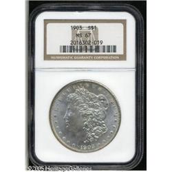 <B>1903<img border='0' src='http://www.heritagecoins.com/images/star.gif' width=10 height=10>$1 MS67 NGC.</B></I> A better coin in such a superior grade. The surfaces are slightly matte-like but lustrous, with nice silver-white color rippling across the obverse and reverse. Details of the highpoints are sharp, the only marks worth mentioning appear below the eagle's left (facing) wing. This is a coin for the fussy collector. Population: 47 in 67, 1 finer (1/05).<BR><I>From The Banks Collection.</B></I> Lot:10609