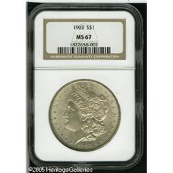 <B>1903<img border='0' src='http://www.heritagecoins.com/images/star.gif' width=10 height=10>$1 MS67 NGC.</B></I> A relatively common P-mint issue, high quality 1903 Morgan Dollars are popular due to their aesthetic appeal. This is a well produced issue, and the present example is no exception. Every feature is boldly, if not fully struck, and the luster is thickly frosted. The surfaces are all but abrasion-free beneath a light dusting of pale golden-gray iridescence. A conditionally scarce offering. Population: 48 in 67, 1 finer (1/05). Lot:10611