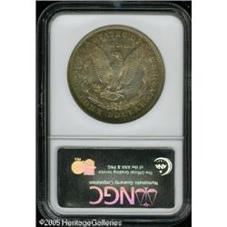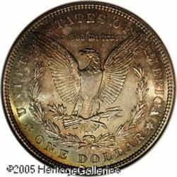 <B>1903<img border='0' src='http://www.heritagecoins.com/images/star.gif' width=10 height=10>$1 MS67 NGC.</B></I> This coin has very attractive and colorful peripheral toning of russet, gold and green with a few splashes of blue tossed in for good measure. Satiny luster in the fields and the strike is sharp for this issue. The centers are blushed with gunmetal gray to bright white. Add to this the Superb Gem quality of the surfaces and you have a really spectacular coin. Population: 48 in 67, 1 finer (1/05). Lot:10610