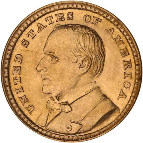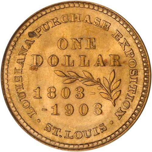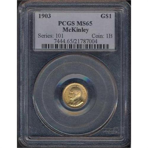 <b>1903 Louisiana Purchase-McKinley Gold Dollar. PCGS graded MS65.</b> Radiant and exhibiting little if any toning other than warm shades of gold. A very pleasing example of this first Commemorative Gold Dollar type. So much, then, for the luster. As for the devices, these were struck with sufficient power by the dies that they left all design elements showing on McKinley, and showing clearly, unlike some where a few areas are mushy <b>(PCGS # 7444)</b>