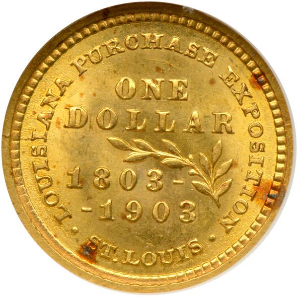 1903 Mckinley $1 Gold. NGC graded MS-63 PQ. Old Holder. Light gold toning. Warm gold in color, the design exhibits eye-opening striking definition.