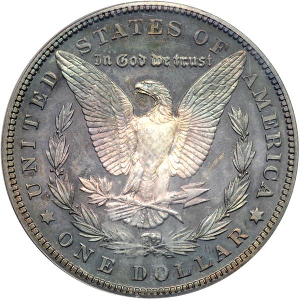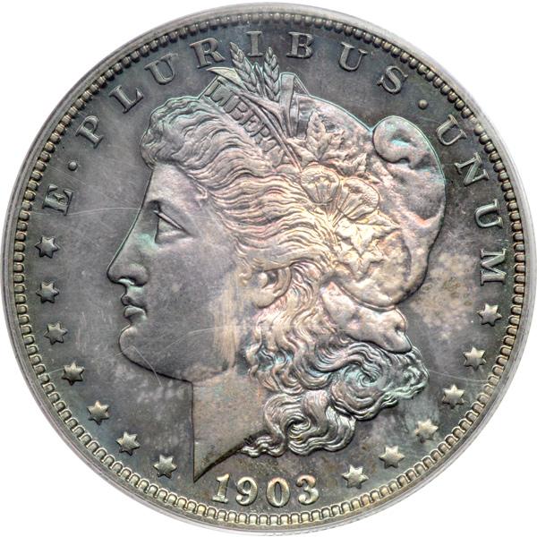 1903 Morgan Dollar. PCGS graded Proof 65. Lovely rainbow toning on both sides. Both sides of this sleek and well mirrored specimen display natural old-time patina which no doubt arises from careful storage for many years in the original Mint tissue paper. When viewed at the proper angle this brings to life to the iridescent colors. Pop 27; 31 finer, 23 in 66, 8 in 67 (PCGS # 7338) .