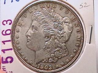 1903 Morgan Dollar. Sharp, amazingly free of marks, and some yellow toning in the lustre. Could be high MS