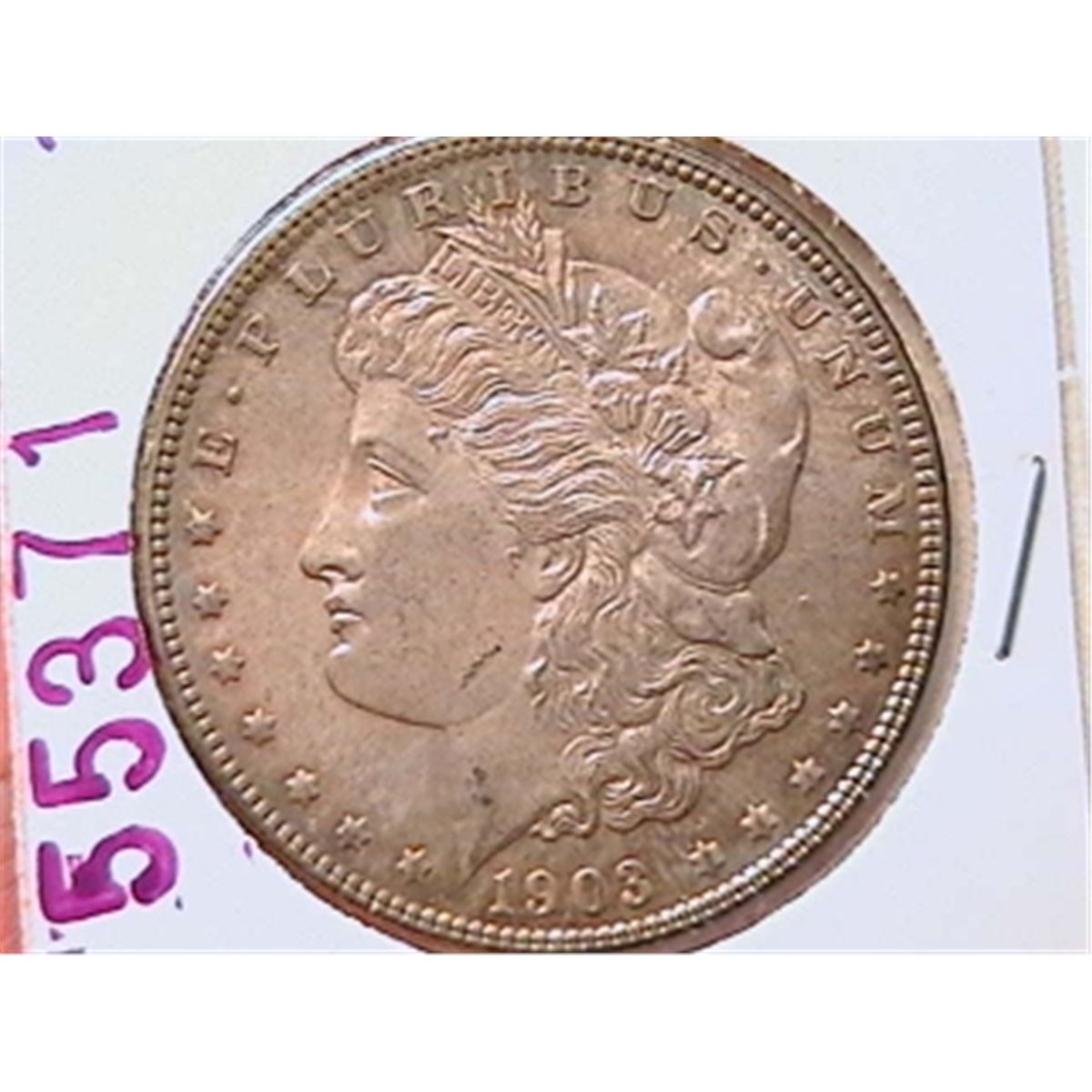 1903 Morgan Dollar MS63. A minimum of marks and nearly full toning. The centers are a creamy gold, with gray, gold, tan, blue-green and turquoise around the peripheries. A distinctive look to this little beauty.