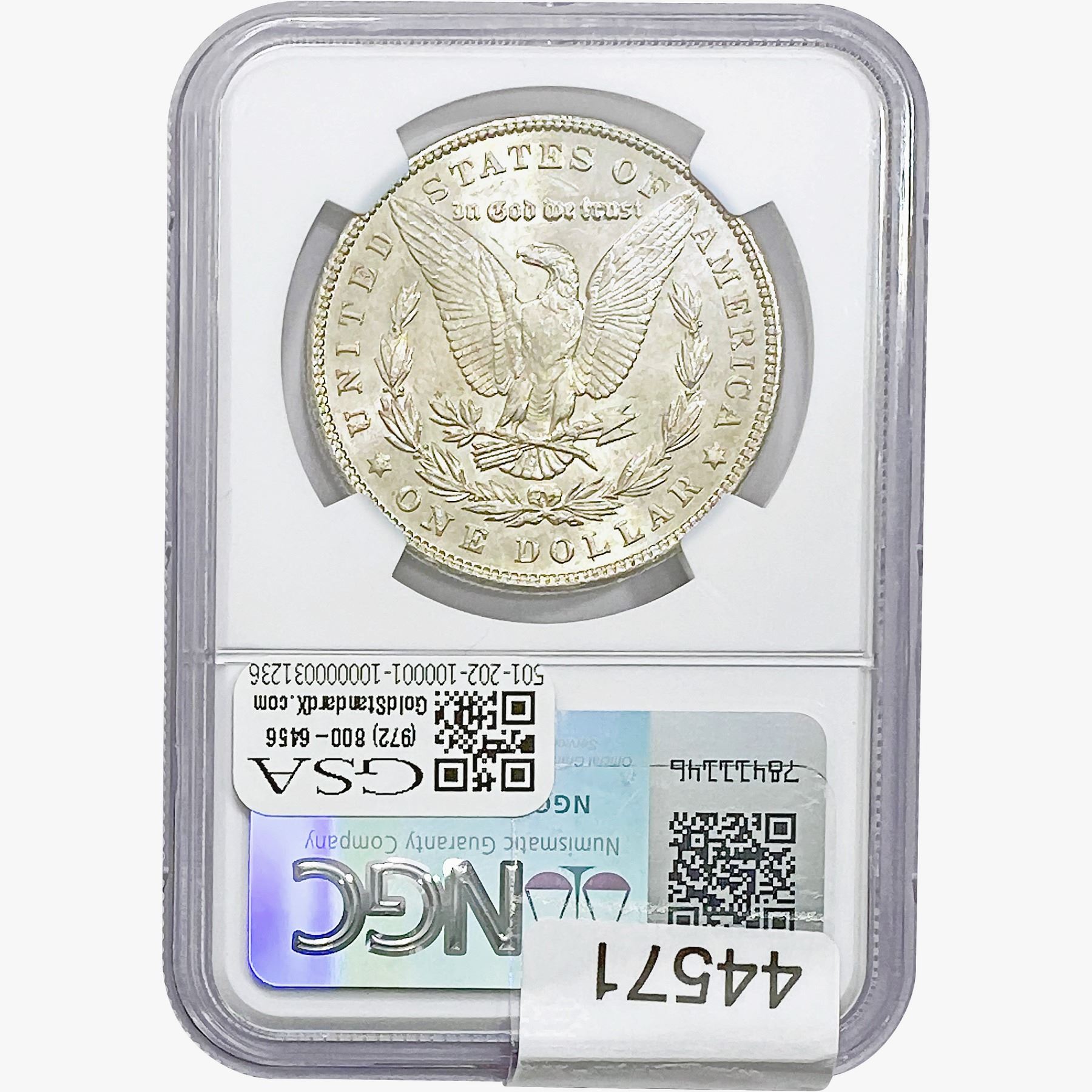 e. Coins sold referencing a third-party grading service are sold “AS IS” without any express or implied warranty, except for a guarantee by GSA that they are genuine. Removal or alteration of the holder, voids all of Bidder’s claims concerning that Product. Certain warranties may be available from the grading services and Bidders are referred to them for further details: Numismatic Guaranty Corporation (NGC), PO Box 4776, Sarasota, FL 34230, www.ngccoin.com/services/writtenguarantee.asp; Professional Coin Grading Services (PCGS), PO Box 9458, Newport Beach, CA 92658, www.pcgs.com/guarantee.html; ANACS, 6555 S. Kenton St., Ste. 303, Englewood, CO 80111; and Independent Coin Grading Co. (ICG), 7901 East Bellview, Ave., Suite 50, Englewood, CO 80111.