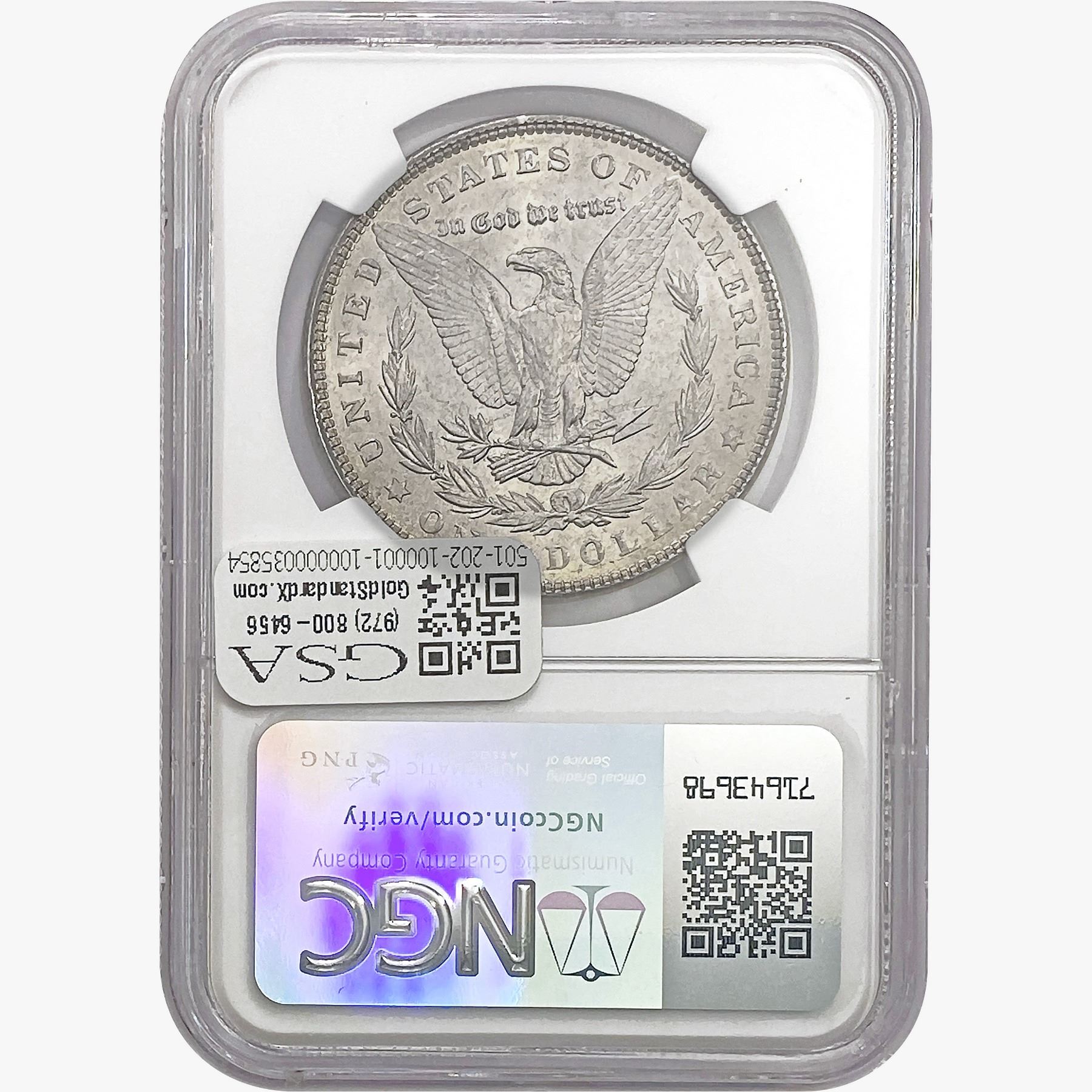 e. Coins sold referencing a third-party grading service are sold “AS IS” without any express or implied warranty, except for a guarantee by GSA that they are genuine. Removal or alteration of the holder, voids all of Bidder’s claims concerning that Product. Certain warranties may be available from the grading services and Bidders are referred to them for further details: Numismatic Guaranty Corporation (NGC), PO Box 4776, Sarasota, FL 34230, www.ngccoin.com/services/writtenguarantee.asp; Professional Coin Grading Services (PCGS), PO Box 9458, Newport Beach, CA 92658, www.pcgs.com/guarantee.html; ANACS, 6555 S. Kenton St., Ste. 303, Englewood, CO 80111; and Independent Coin Grading Co. (ICG), 7901 East Bellview, Ave., Suite 50, Englewood, CO 80111.
