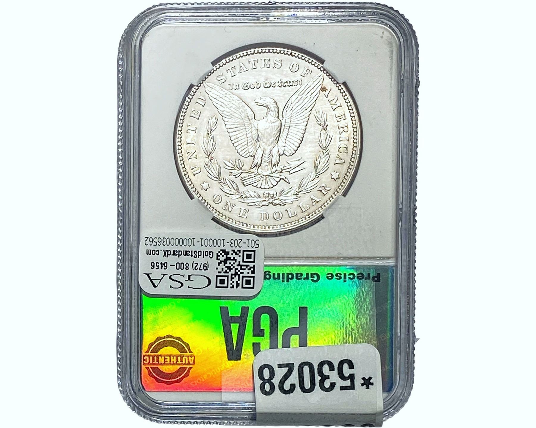 e. Coins sold referencing a third-party grading service are sold “AS IS” without any express or implied warranty, except for a guarantee by GSA that they are genuine. Removal or alteration of the holder, voids all of Bidder’s claims concerning that Product. Certain warranties may be available from the grading services and Bidders are referred to them for further details: Numismatic Guaranty Corporation (NGC), PO Box 4776, Sarasota, FL 34230, www.ngccoin.com/services/writtenguarantee.asp; Professional Coin Grading Services (PCGS), PO Box 9458, Newport Beach, CA 92658, www.pcgs.com/guarantee.html; ANACS, 6555 S. Kenton St., Ste. 303, Englewood, CO 80111; and Independent Coin Grading Co. (ICG), 7901 East Bellview, Ave., Suite 50, Englewood, CO 80111.