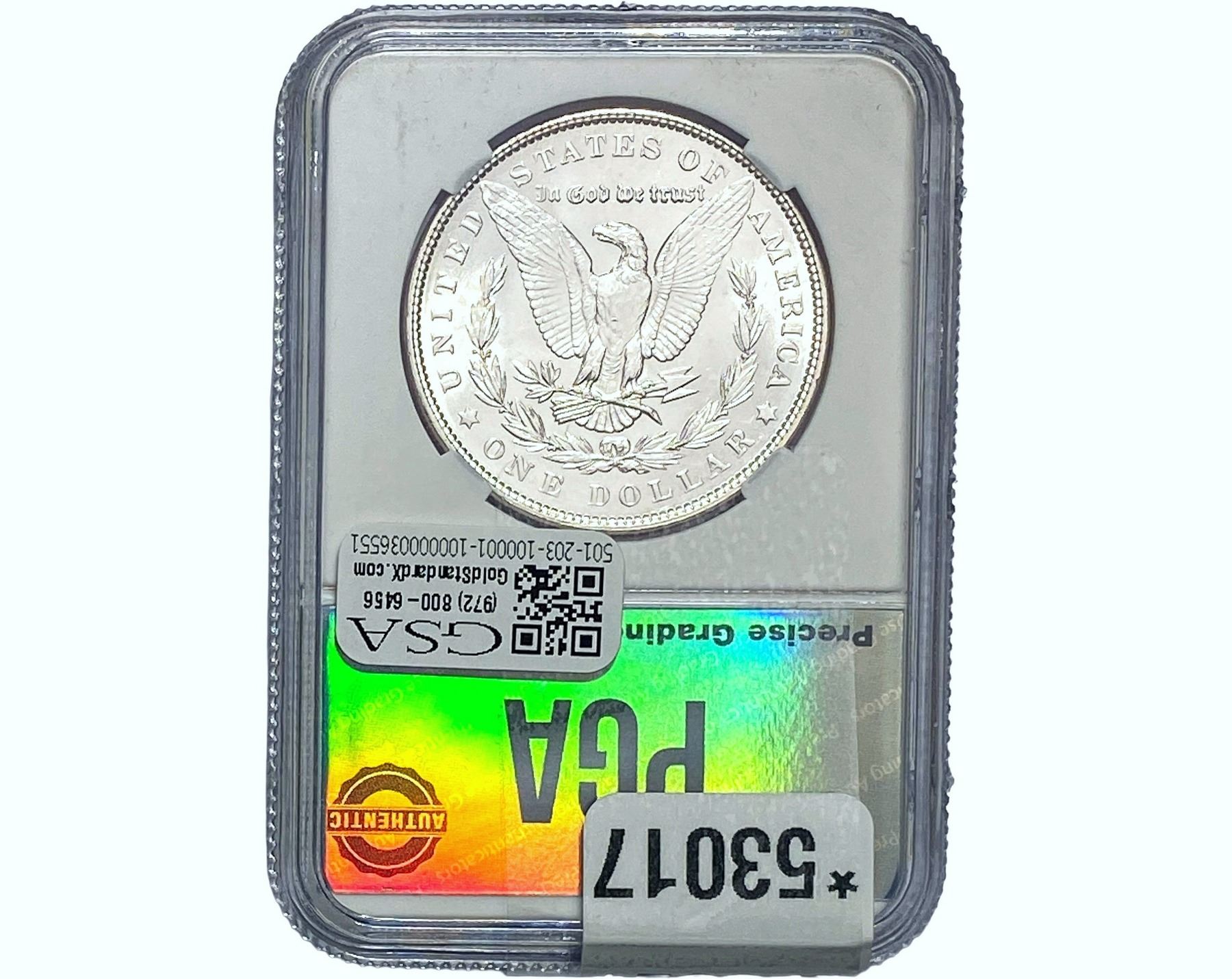 e. Coins sold referencing a third-party grading service are sold “AS IS” without any express or implied warranty, except for a guarantee by GSA that they are genuine. Removal or alteration of the holder, voids all of Bidder’s claims concerning that Product. Certain warranties may be available from the grading services and Bidders are referred to them for further details: Numismatic Guaranty Corporation (NGC), PO Box 4776, Sarasota, FL 34230, www.ngccoin.com/services/writtenguarantee.asp; Professional Coin Grading Services (PCGS), PO Box 9458, Newport Beach, CA 92658, www.pcgs.com/guarantee.html; ANACS, 6555 S. Kenton St., Ste. 303, Englewood, CO 80111; and Independent Coin Grading Co. (ICG), 7901 East Bellview, Ave., Suite 50, Englewood, CO 80111.