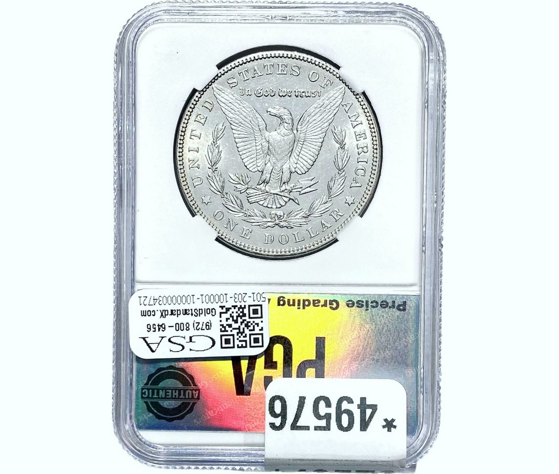 e. Coins sold referencing a third-party grading service are sold “AS IS” without any express or implied warranty, except for a guarantee by GSA that they are genuine. Removal or alteration of the holder, voids all of Bidder’s claims concerning that Product. Certain warranties may be available from the grading services and Bidders are referred to them for further details: Numismatic Guaranty Corporation (NGC), PO Box 4776, Sarasota, FL 34230, www.ngccoin.com/services/writtenguarantee.asp; Professional Coin Grading Services (PCGS), PO Box 9458, Newport Beach, CA 92658, www.pcgs.com/guarantee.html; ANACS, 6555 S. Kenton St., Ste. 303, Englewood, CO 80111; and Independent Coin Grading Co. (ICG), 7901 East Bellview, Ave., Suite 50, Englewood, CO 80111.