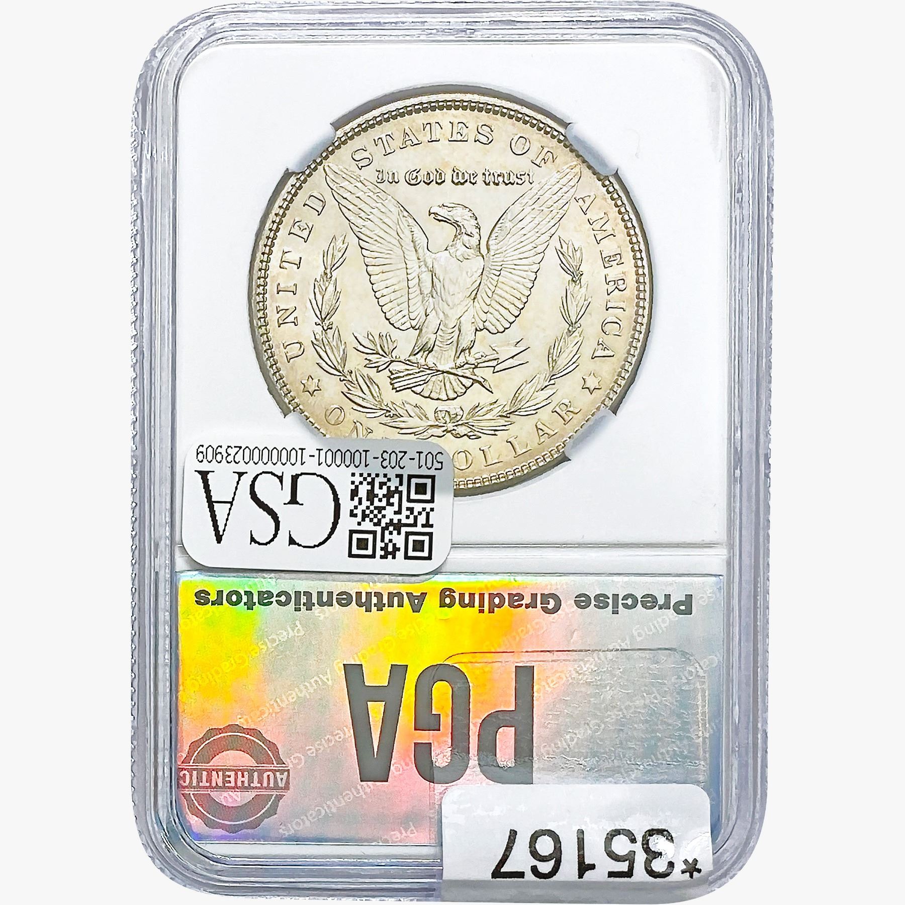 COINS AND CURRENCY LISTED IN GSA’S CATALOG AS GRADED AND ENCAPSULATED BY PCGS, NGC, ANACS, ICG, PCGS CURRENCY, PMG, PCGS BANKNOTE GRADING, CMC OR ANY OTHER THIRD-PARTY GRADING SERVICE ARE LIKEWISE SOLD “AS-IS” EXCEPT AS EXPRESSLY SET FORTH HEREIN. ALL THIRD-PARTY GRADING SERVICE GUARANTEES, INCLUDING AUTHENTICITY, ARE THE SOLE RESPONSIBILITY OF THE THIRD-PARTY GRADING SERVICE AND NOT WARRANTIES OR GUARANTEES OF GSA. BIDDERS SHOULD CONTACT THESE THIRD-PARTY GRADING SERVICES DIRECTLY WITH RESPECT TO ANY CLAIMS OR QUESTIONS THEY MAY HAVE CONCERNING THEIR GUARANTEES AND WARRANTIES. BIDDERS ACKNOWLEDGE AND AGREE THAT AUCTIONEER IS NOT BOUND BY OR LIABLE FOR ANY OPINION OR CERTIFICATION BY ANY THIRD-PARTY GRADING SERVICE. REMOVAL OF A PRODUCT FROM ITS PROTECTIVE CASING OR HOLDER OR ALTERATION OF ANY COIN HOLDER WAIVES ALL RIGHTS CONCERNING THE PRODUCT CONTAINED THEREIN.