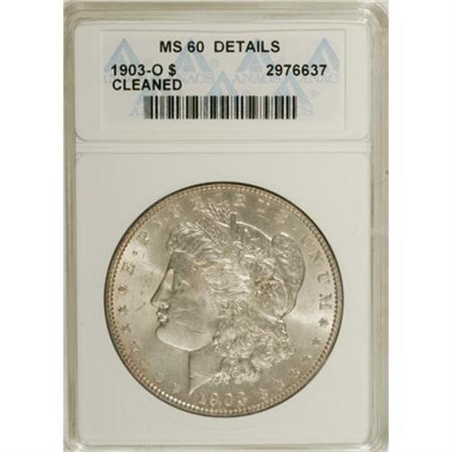 <B>1903-O $1 --Cleaned--ANACS. MS60 Details.</B></I> NGC Census: (9/4501). PCGS Population (29/8394). Mintage: 4,450,000. Numismedia Wsl. Price for NGC/PCGS coin in MS60: $330. (#7286)<BR><BR><b>Shipping:</b> Coins & Currency (<a target="_blank" href="http://www.heritageauctions.com/common/shipping.php">view shipping information</a>)