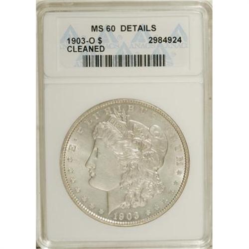 <B>1903-O $1 --Cleaned--ANACS. MS60 Details.</B></I> NGC Census: (9/4517). PCGS Population (29/8394). Mintage: 4,450,000. Numismedia Wsl. Price for NGC/PCGS coin in MS60: $333. (#7286)<BR><BR><b>Shipping:</b> Coins & Currency (<a target="_blank" href="http://www.heritageauctions.com/common/shipping.php">view shipping information</a>)