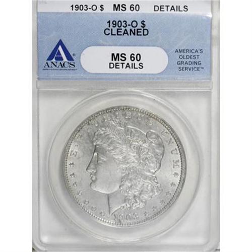 <B>1903-O $1 --Cleaned--ANACS MS60 Details.</B></I> NGC Census: (9/4705). PCGS Population (29/8686). Mintage: 4,450,000. Numismedia Wsl. Price for NGC/PCGS coin in MS60: $333. (#7286)<BR><BR><B>Coin Engraver:</B> George T. Morgan<BR><BR><b>Shipping:</b> Coins & Currency (<a target="_blank" href="http://www.heritageauctions.com/common/shipping.php">view shipping information</a>)
