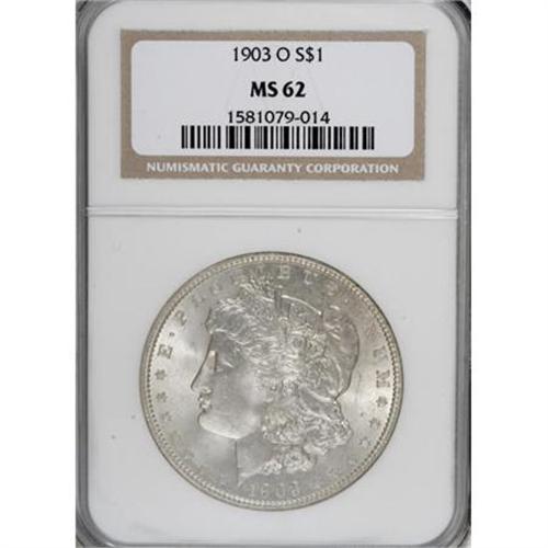 <B>1903-O $1 MS62 NGC.</B></I> NGC Census: (309/4208). PCGS Population (670/7740). Mintage: 4,450,000. Numismedia Wsl. Price for NGC/PCGS coin in MS62: $350. (#7286)<BR><BR><B>Coin Engraver:</B> George T. Morgan<BR><BR><b>Shipping:</b> Coins & Currency (<a target="_blank" href="http://www.heritageauctions.com/common/shipping.php">view shipping information</a>)