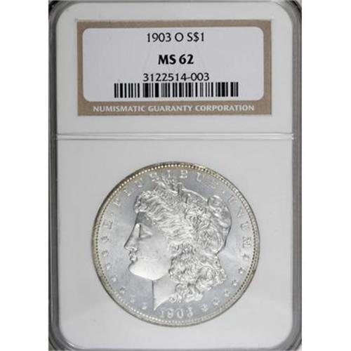 <B>1903-O $1 MS62 NGC.</B></I> NGC Census: (318/4279). PCGS Population (675/7823). Mintage: 4,450,000. Numismedia Wsl. Price for NGC/PCGS coin in MS62: $350. (#7286)<BR><BR><B>Coin Engraver:</B> George T. Morgan<BR><BR><b>Shipping:</b> Coins & Currency (<a target="_blank" href="http://www.heritageauctions.com/common/shipping.php">view shipping information</a>)